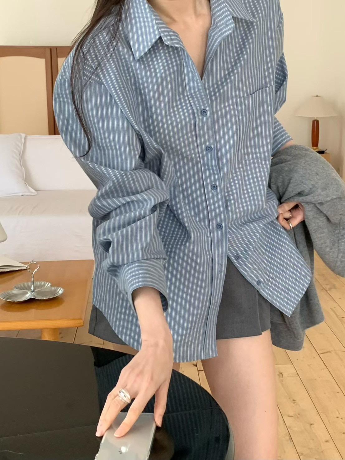 落肩直紋寬鬆襯衫