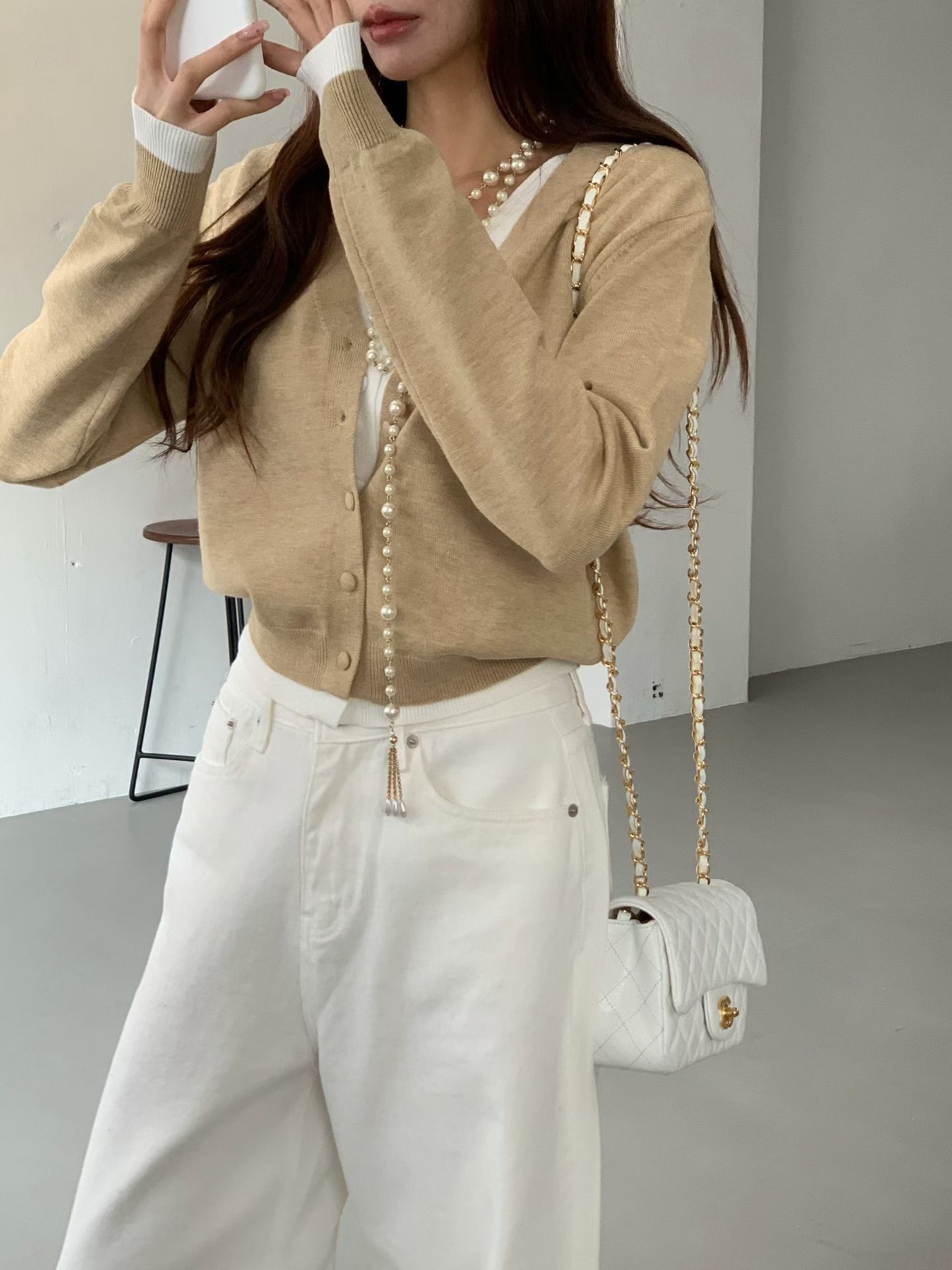 薄款花呢抽鬚短版珍珠釦小香外套
