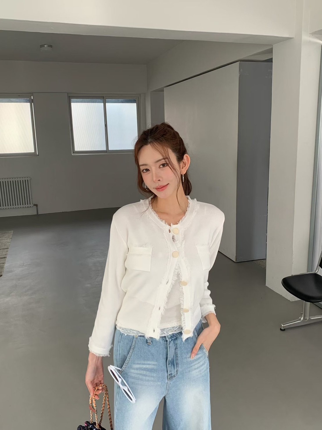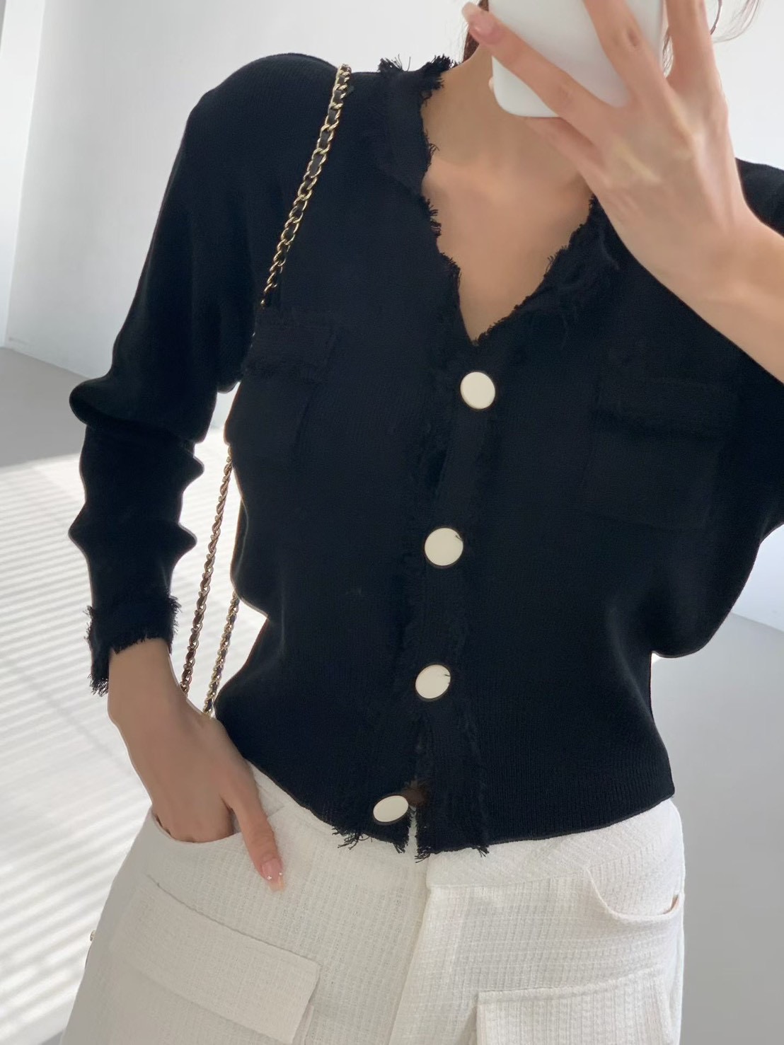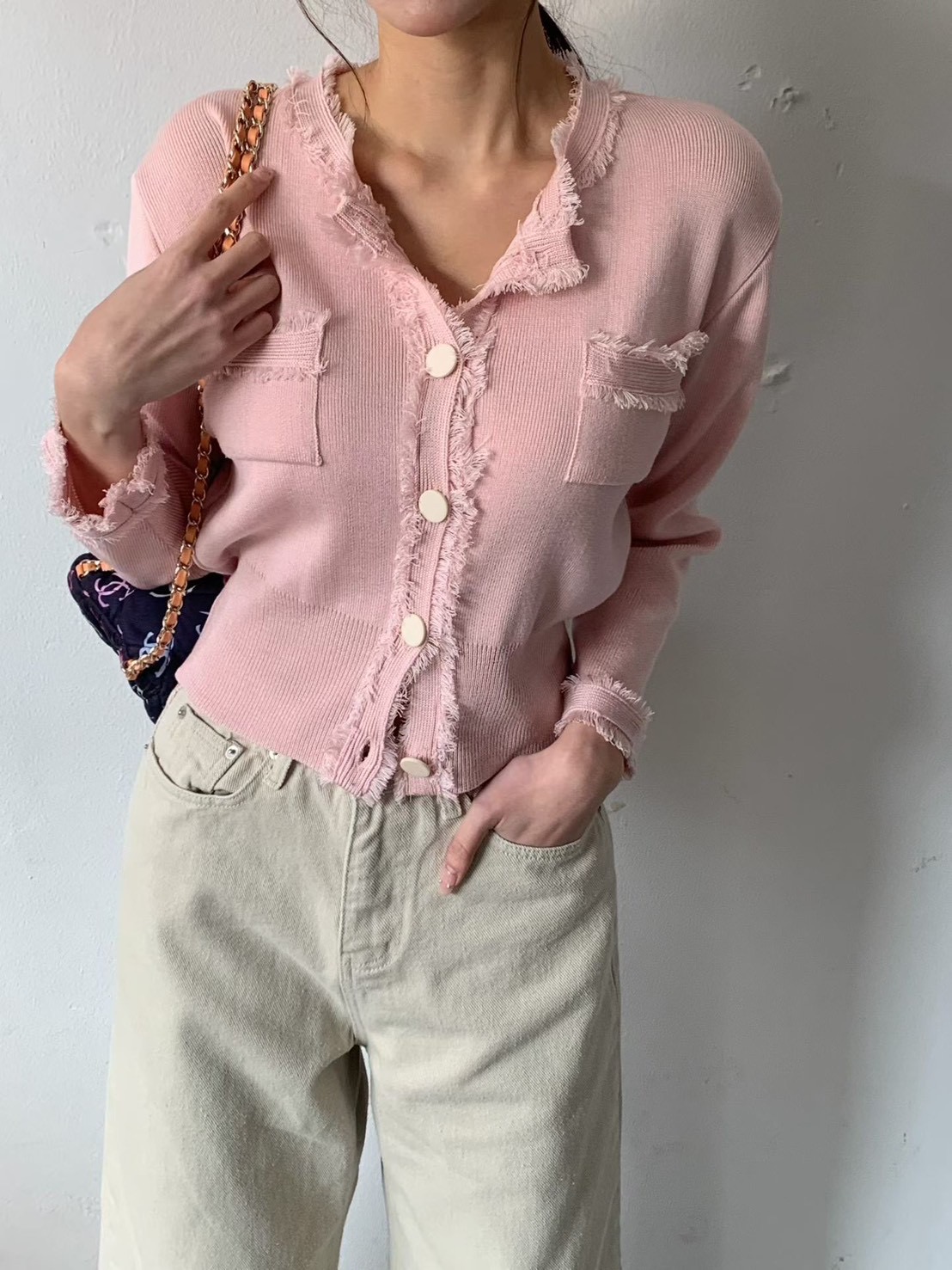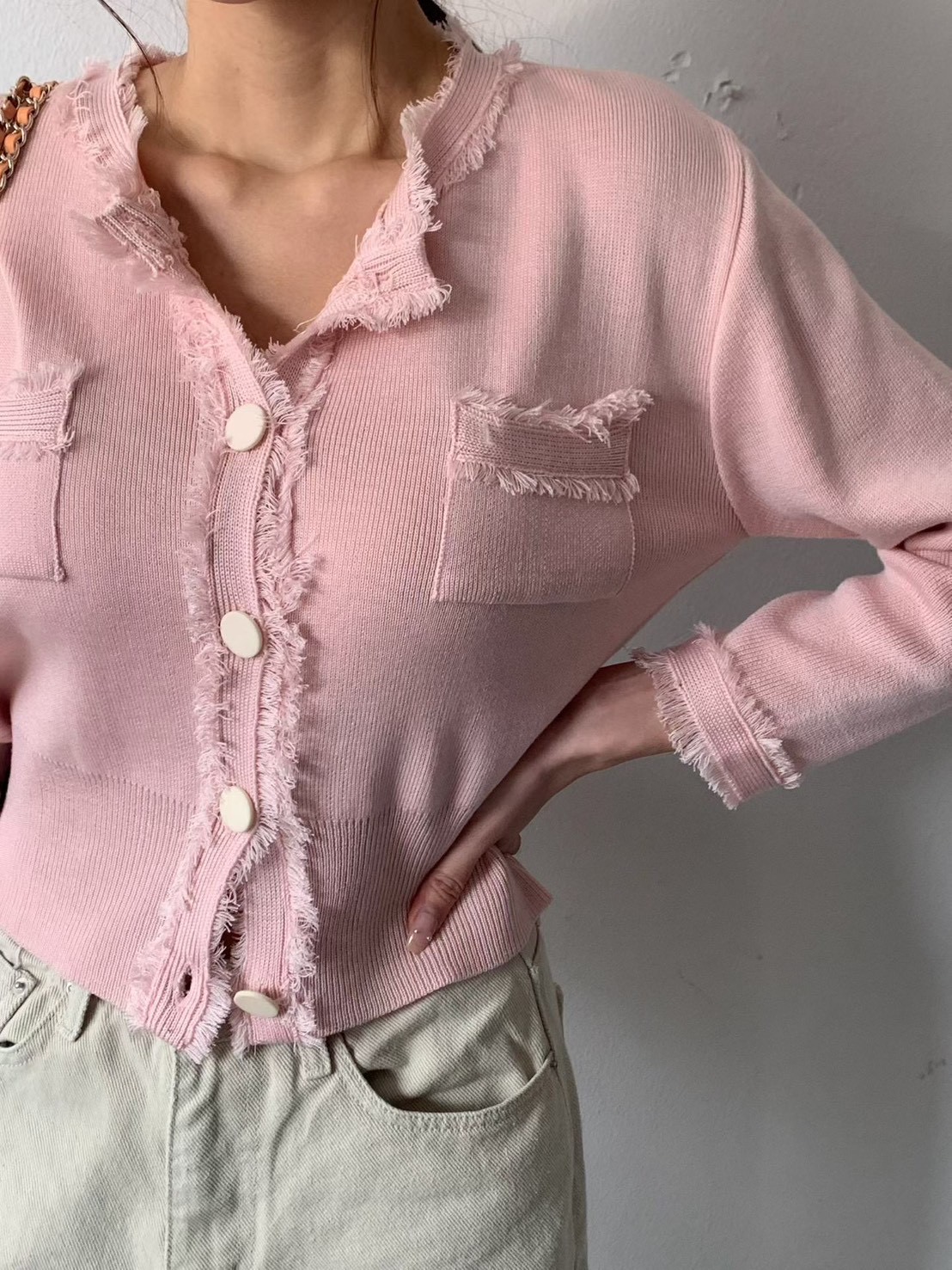 大圓釦抓破感滾邊設計針織衫