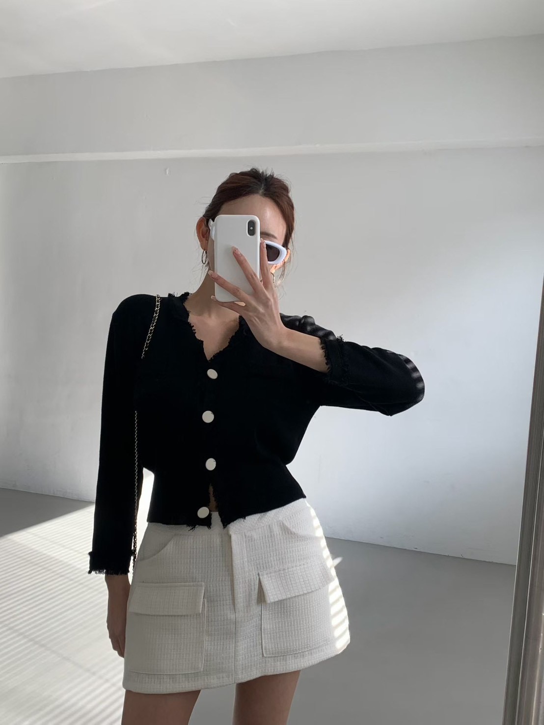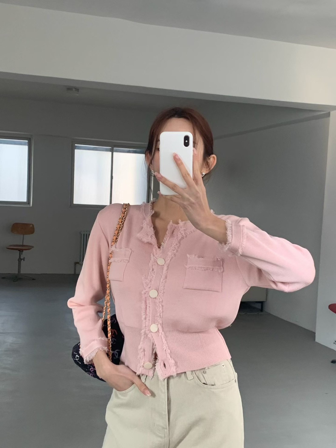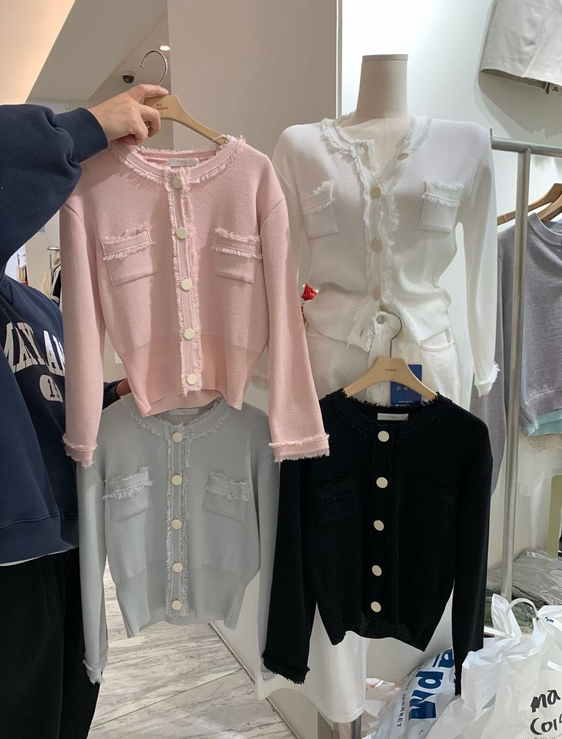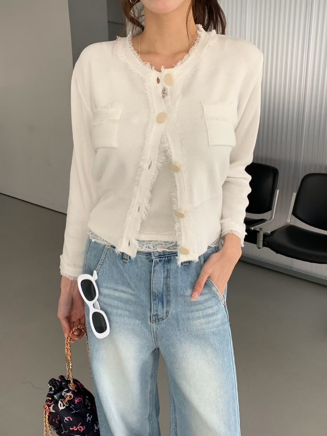 大圓釦抓破感滾邊設計針織衫