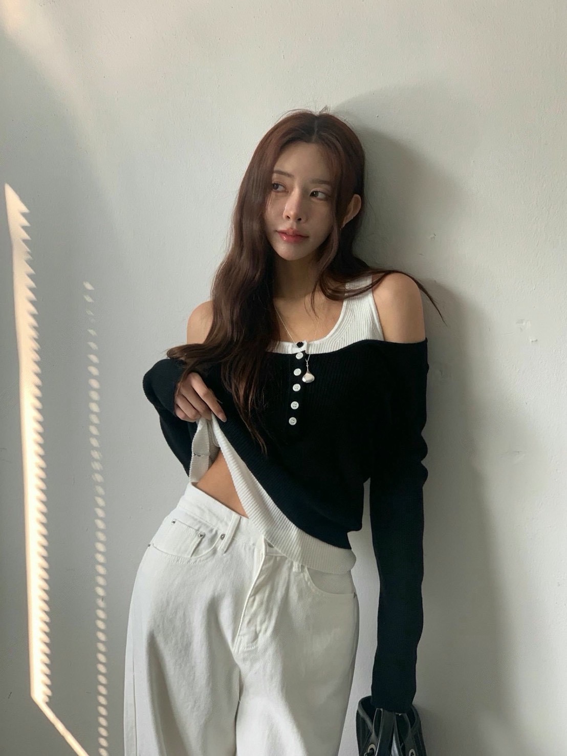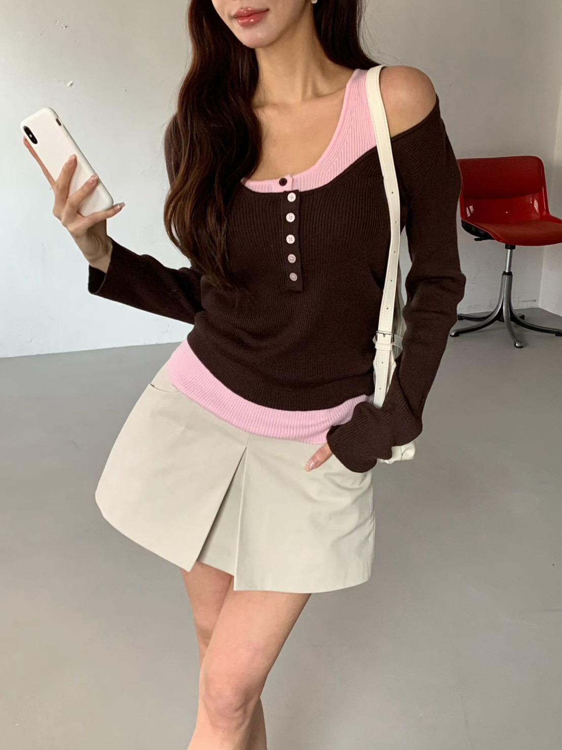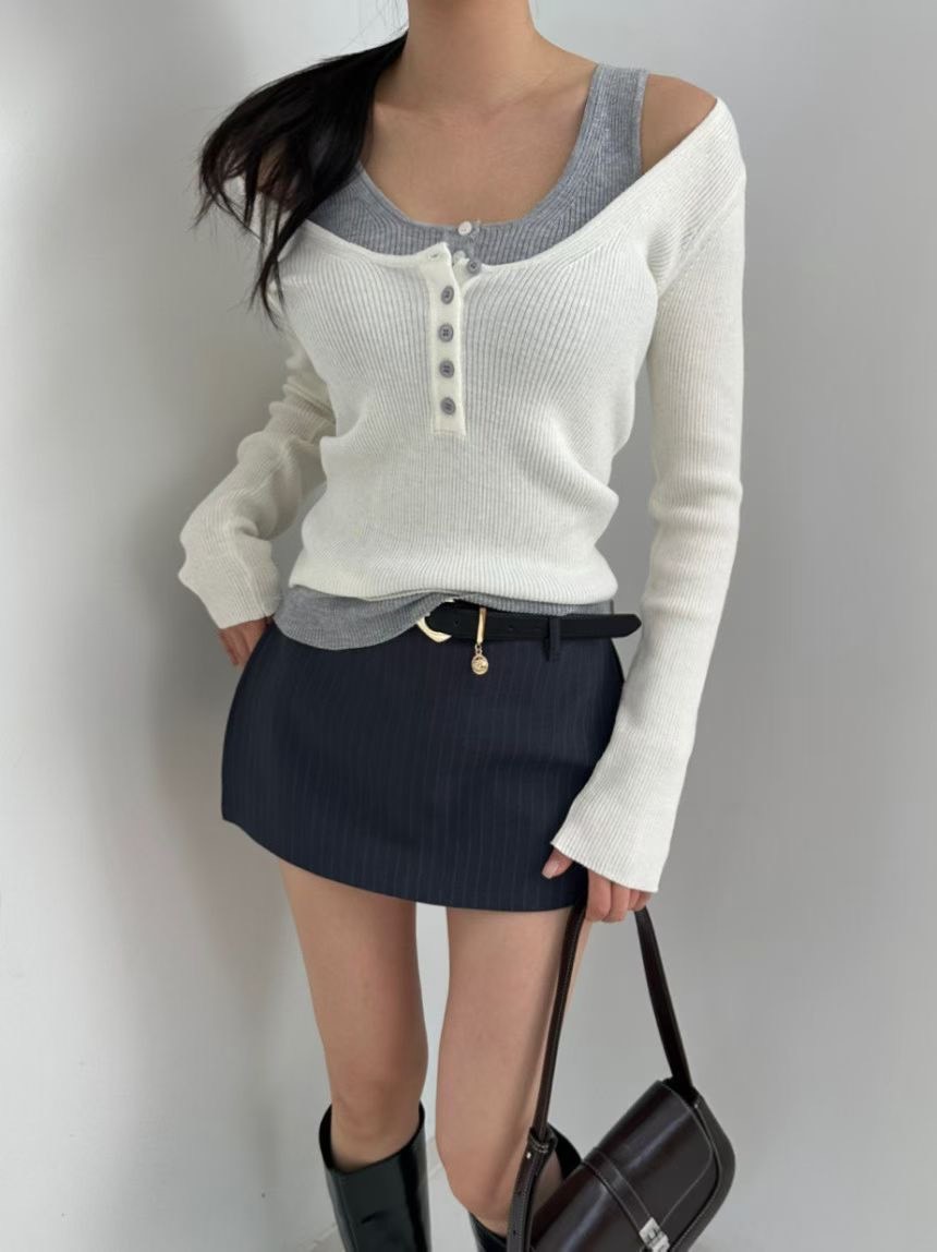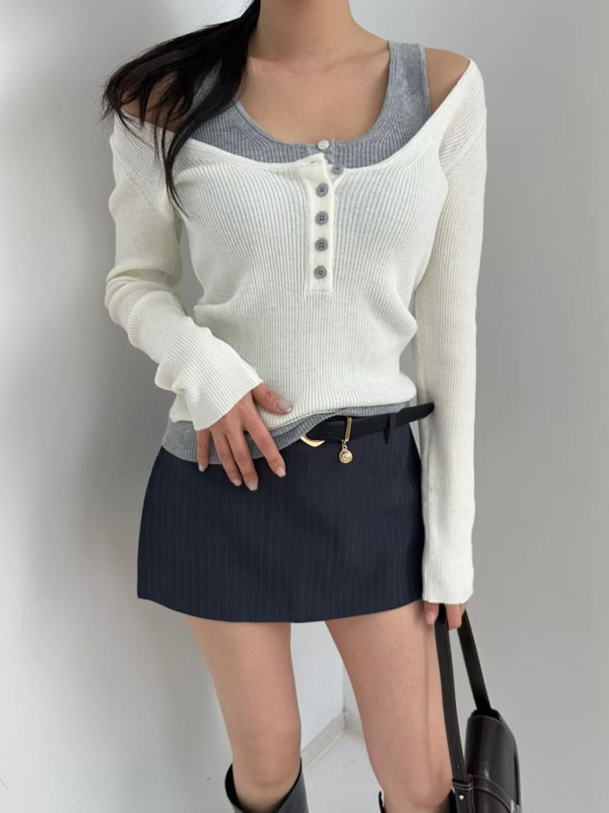 假兩件撞色U領排釦針織衫