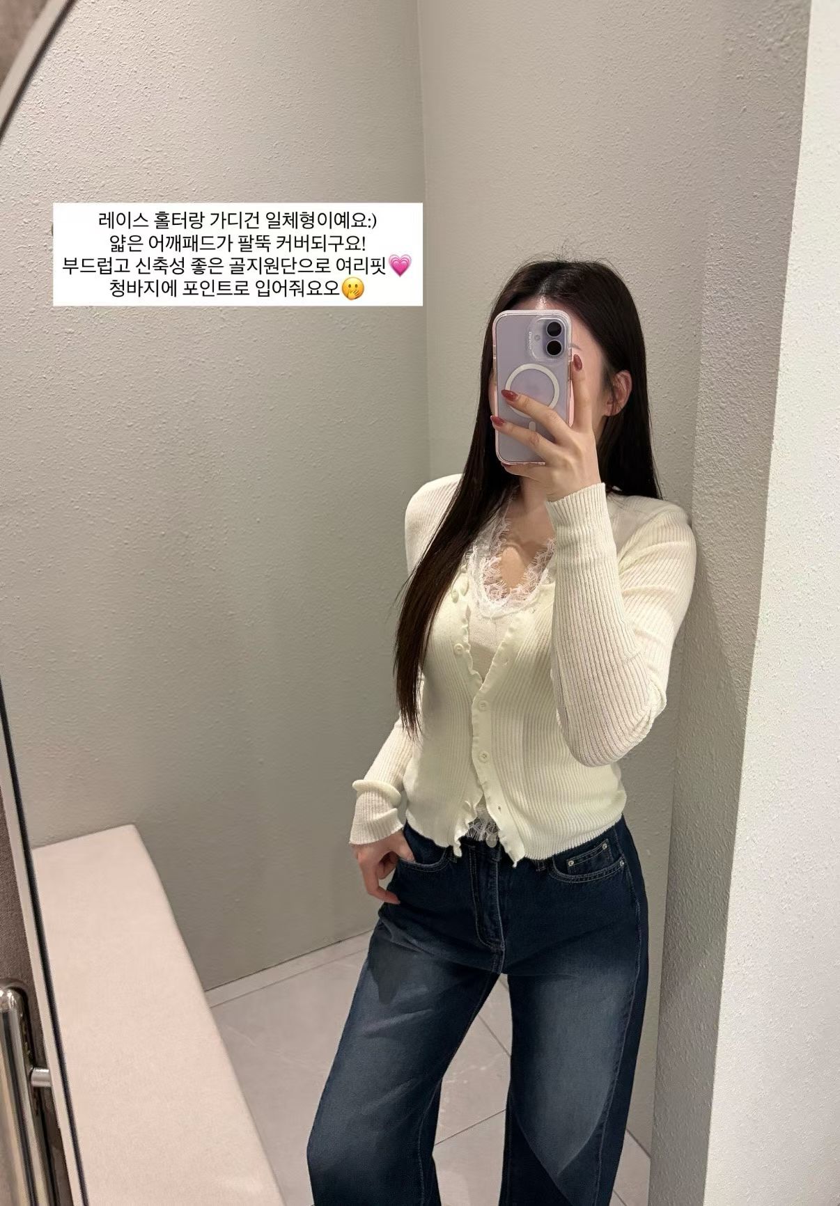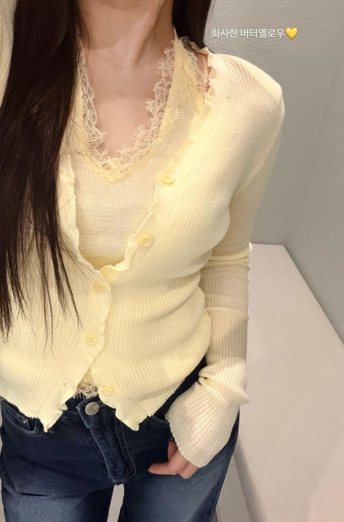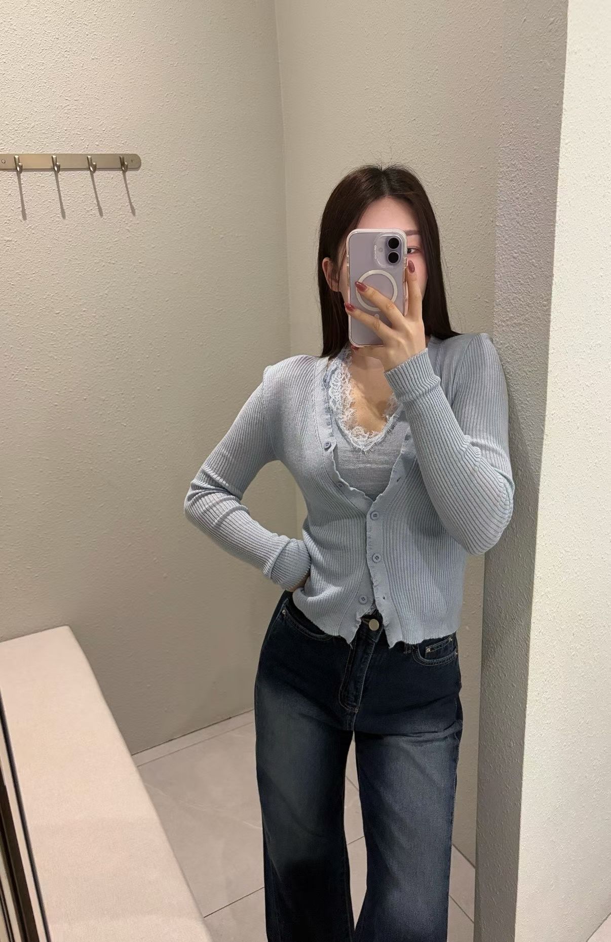 蕾絲滾邊背心+排釦外套假兩件針織衫