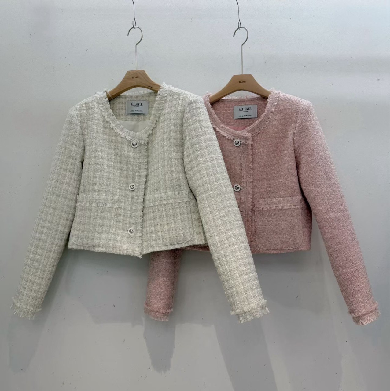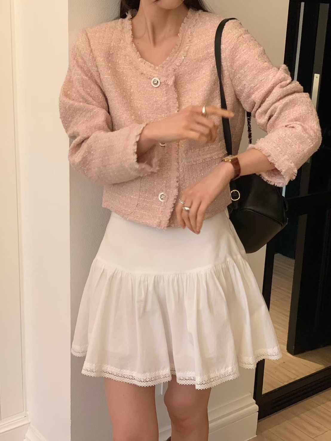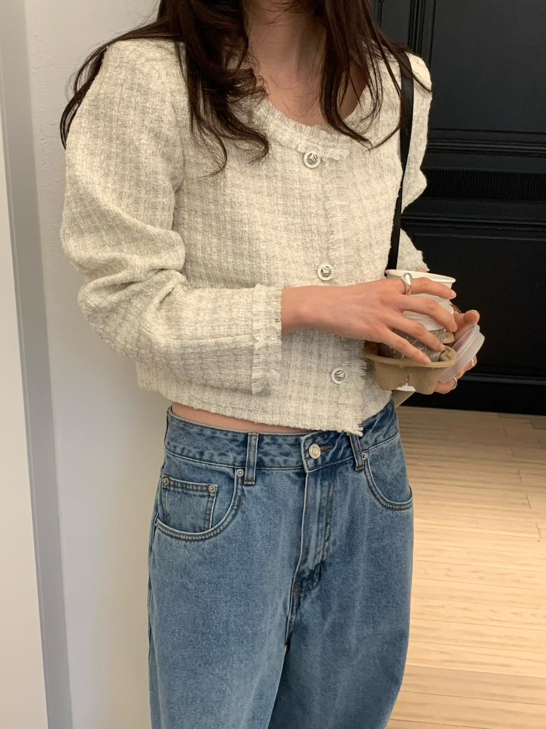薄款花呢抽鬚短版珍珠釦小香外套