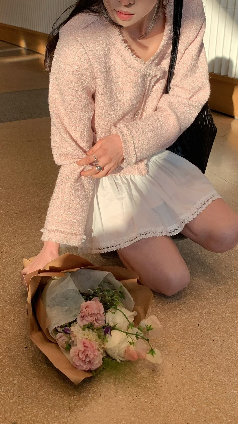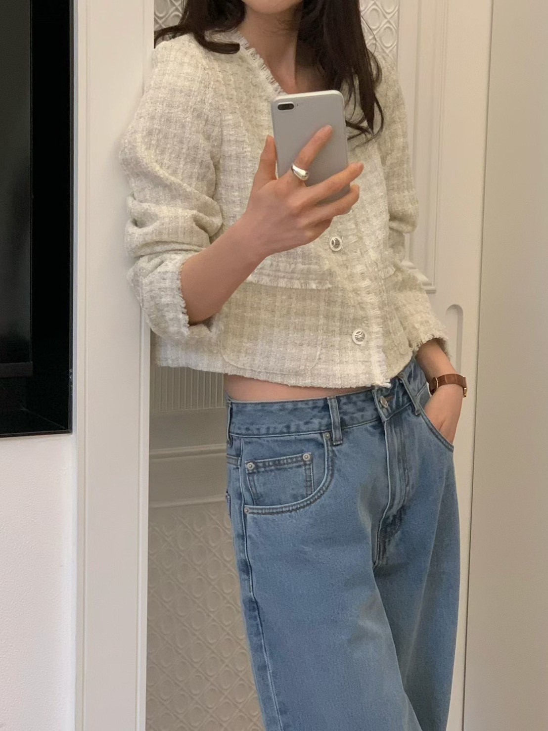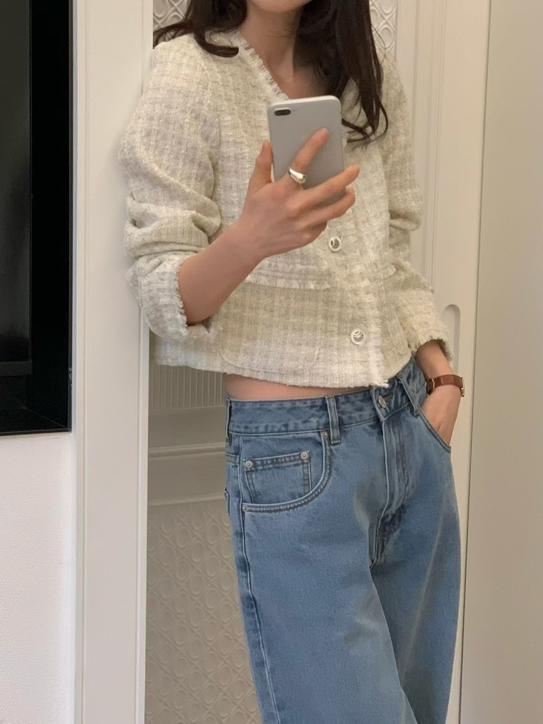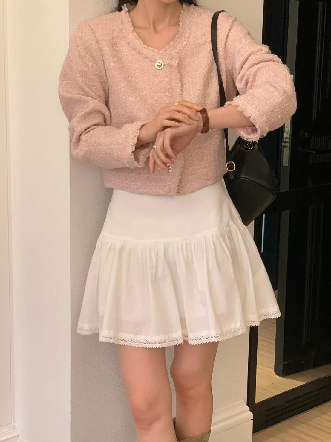 薄款花呢抽鬚短版珍珠釦小香外套