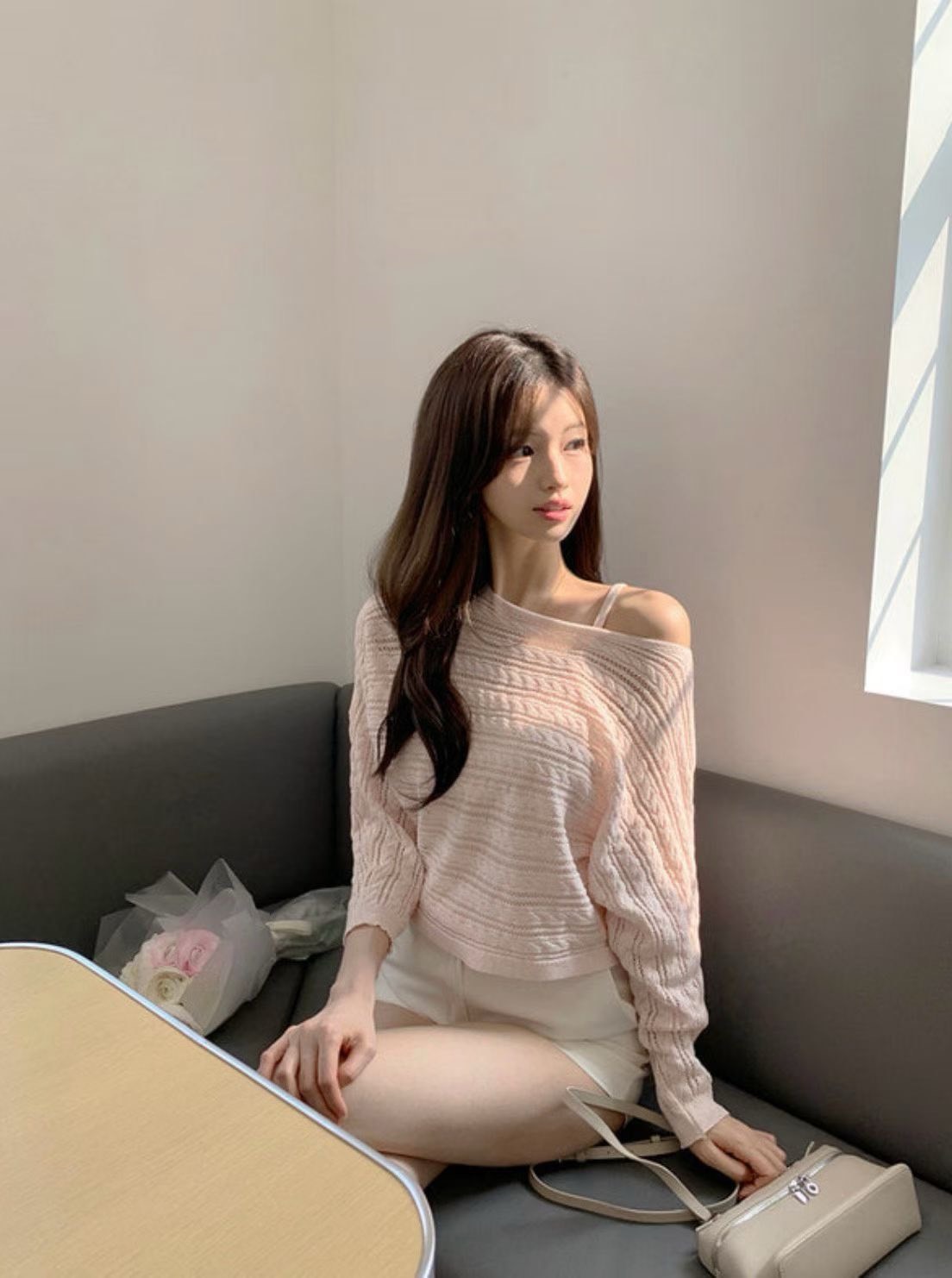 鏤空橫紋麻花斜肩針織衫+小背心SET