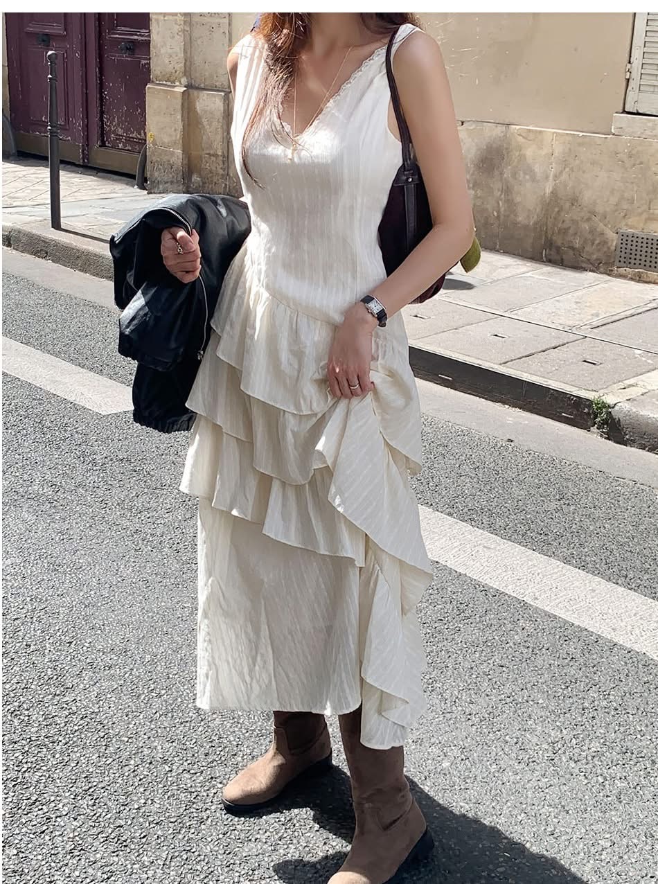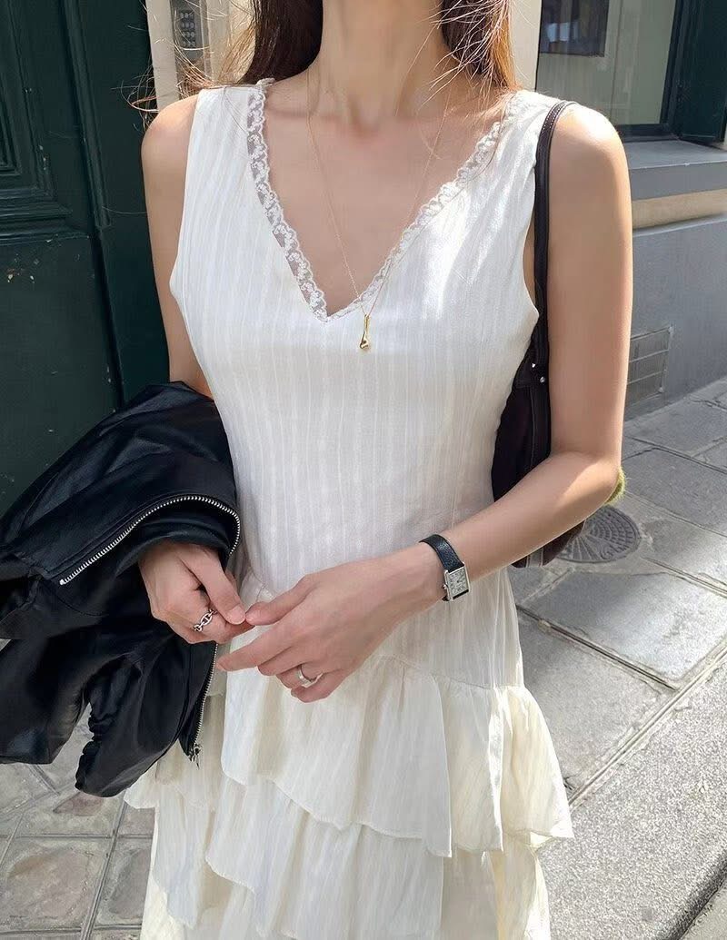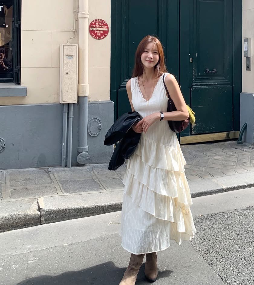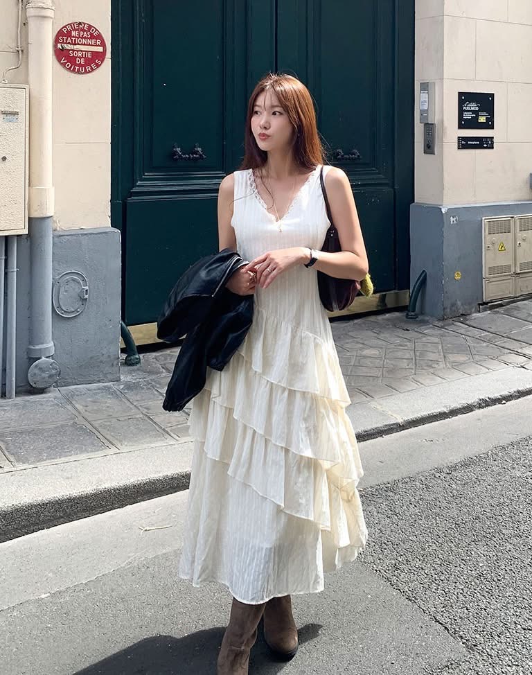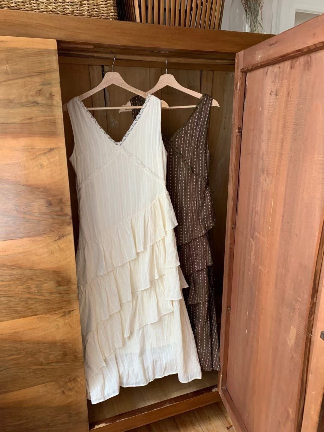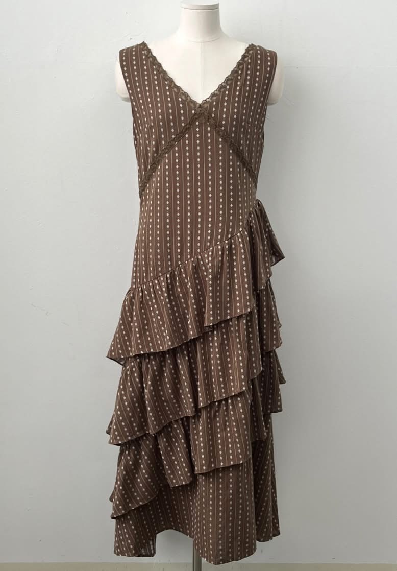 蕾絲V領小花刺繡斜邊層次蛋糕長洋
