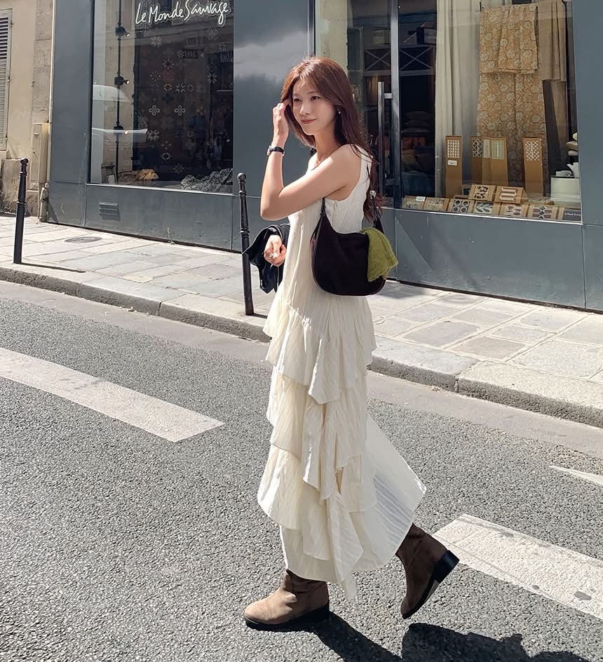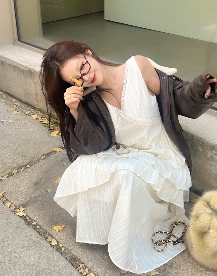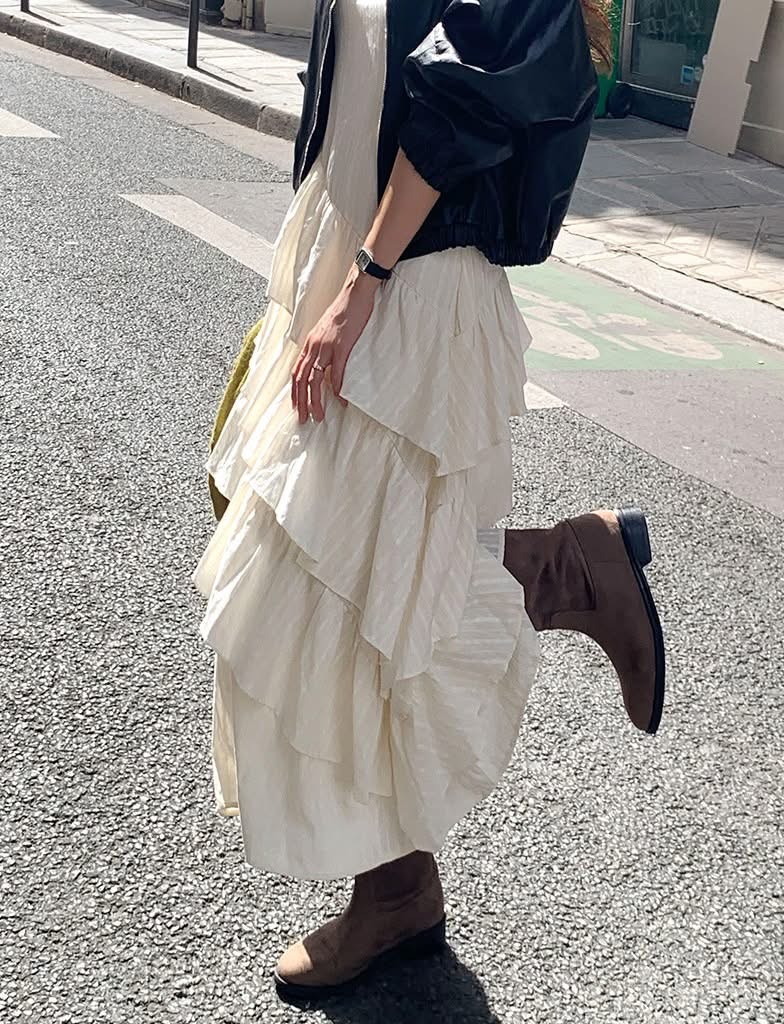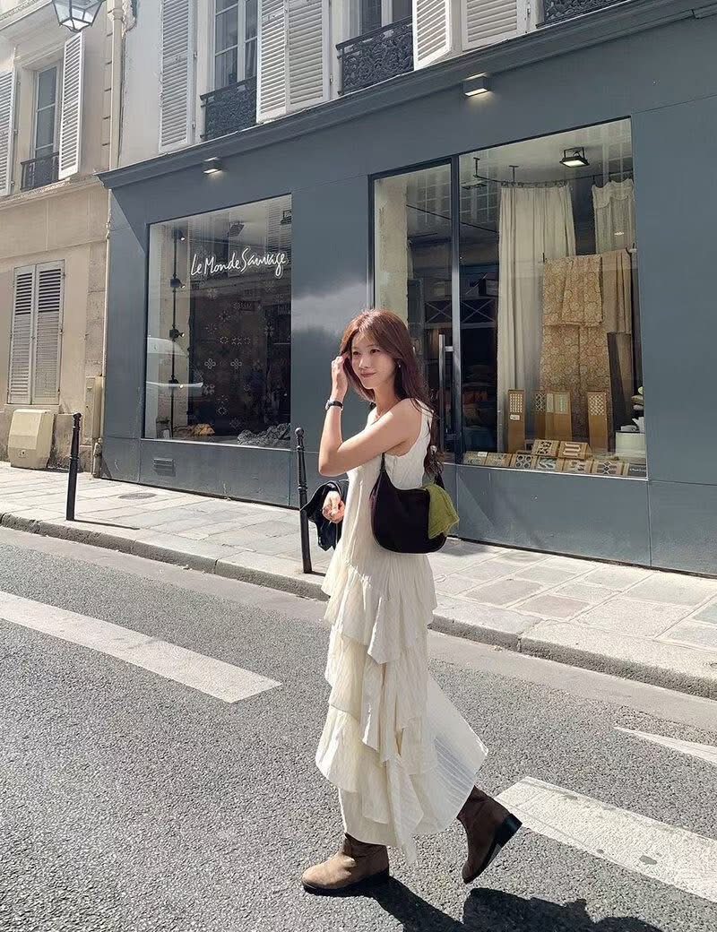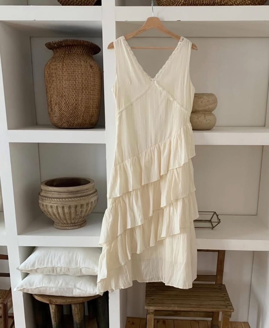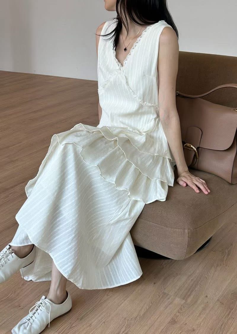 蕾絲V領小花刺繡斜邊層次蛋糕長洋