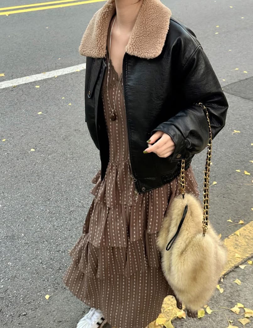 皮革領拼接絨面拉鍊夾克外