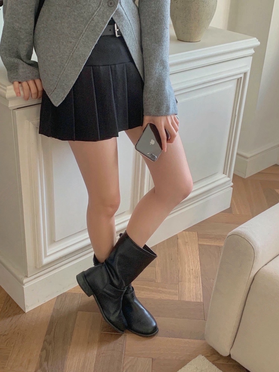 圓頭金釦繫帶膝下長靴