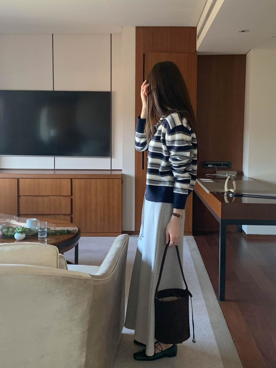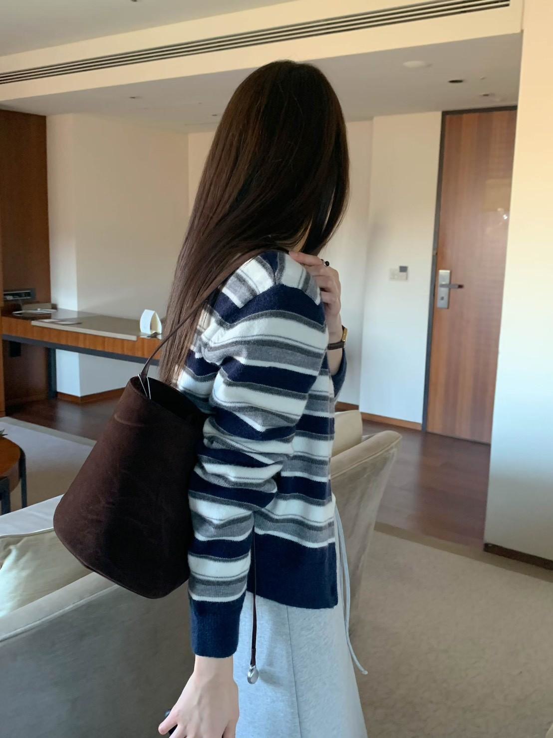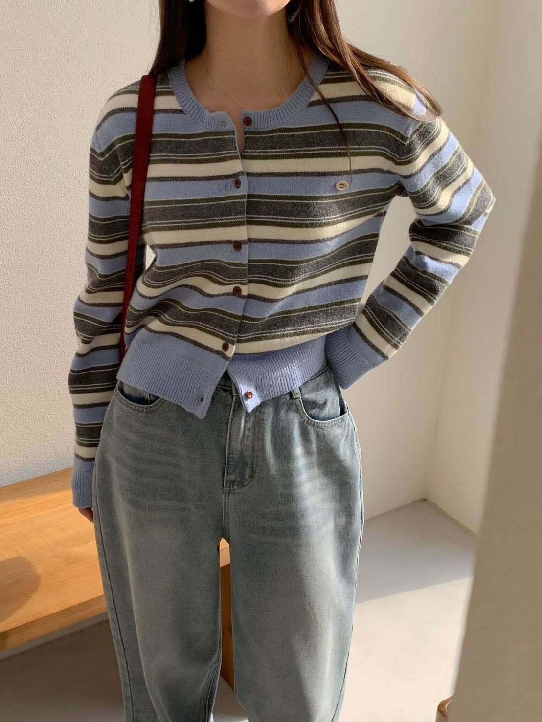 Y領撞色橫條紋排釦針織衫