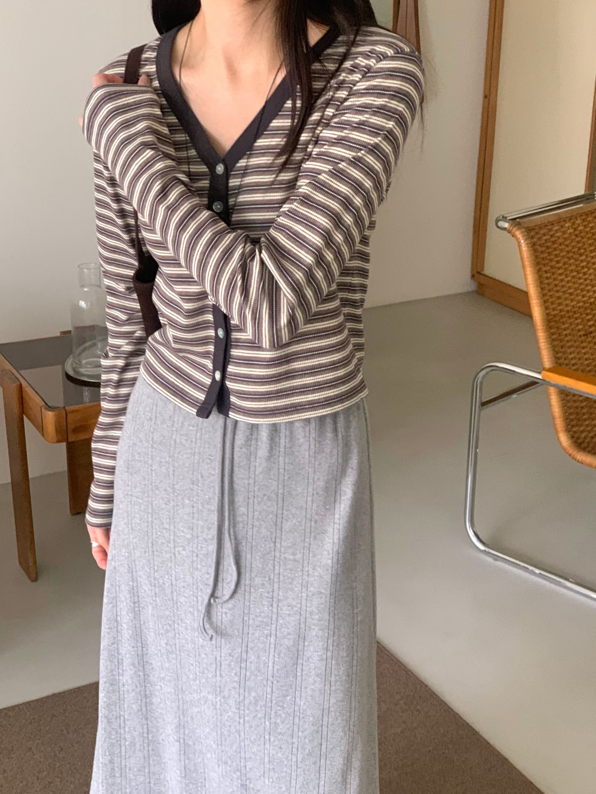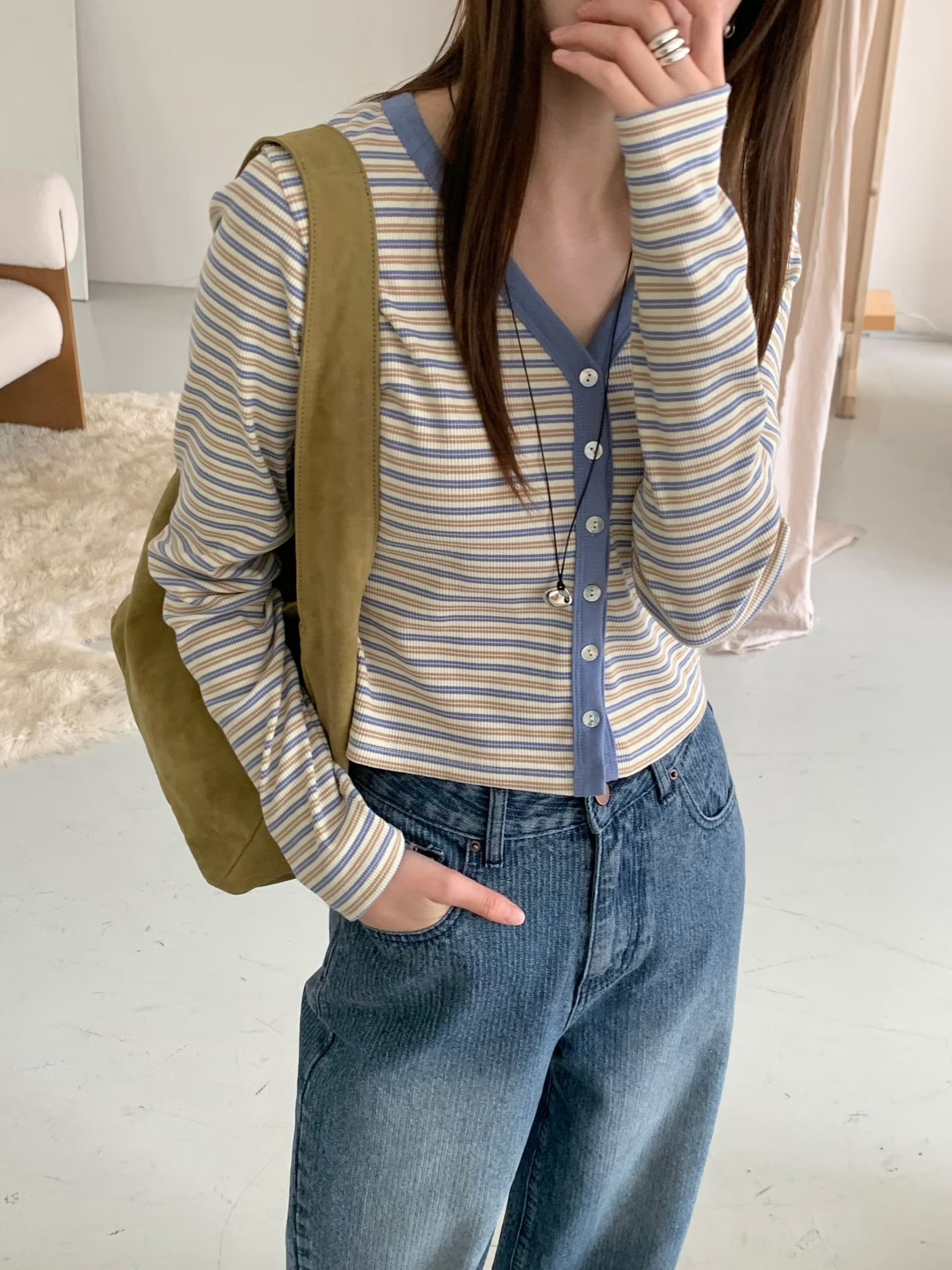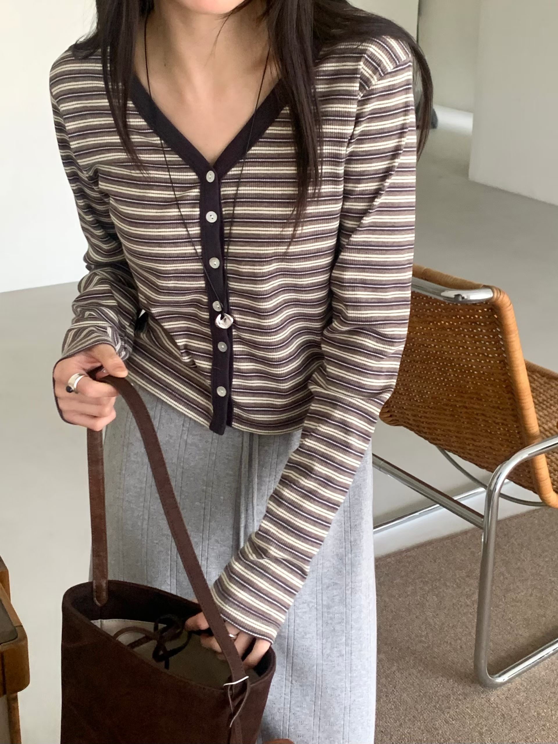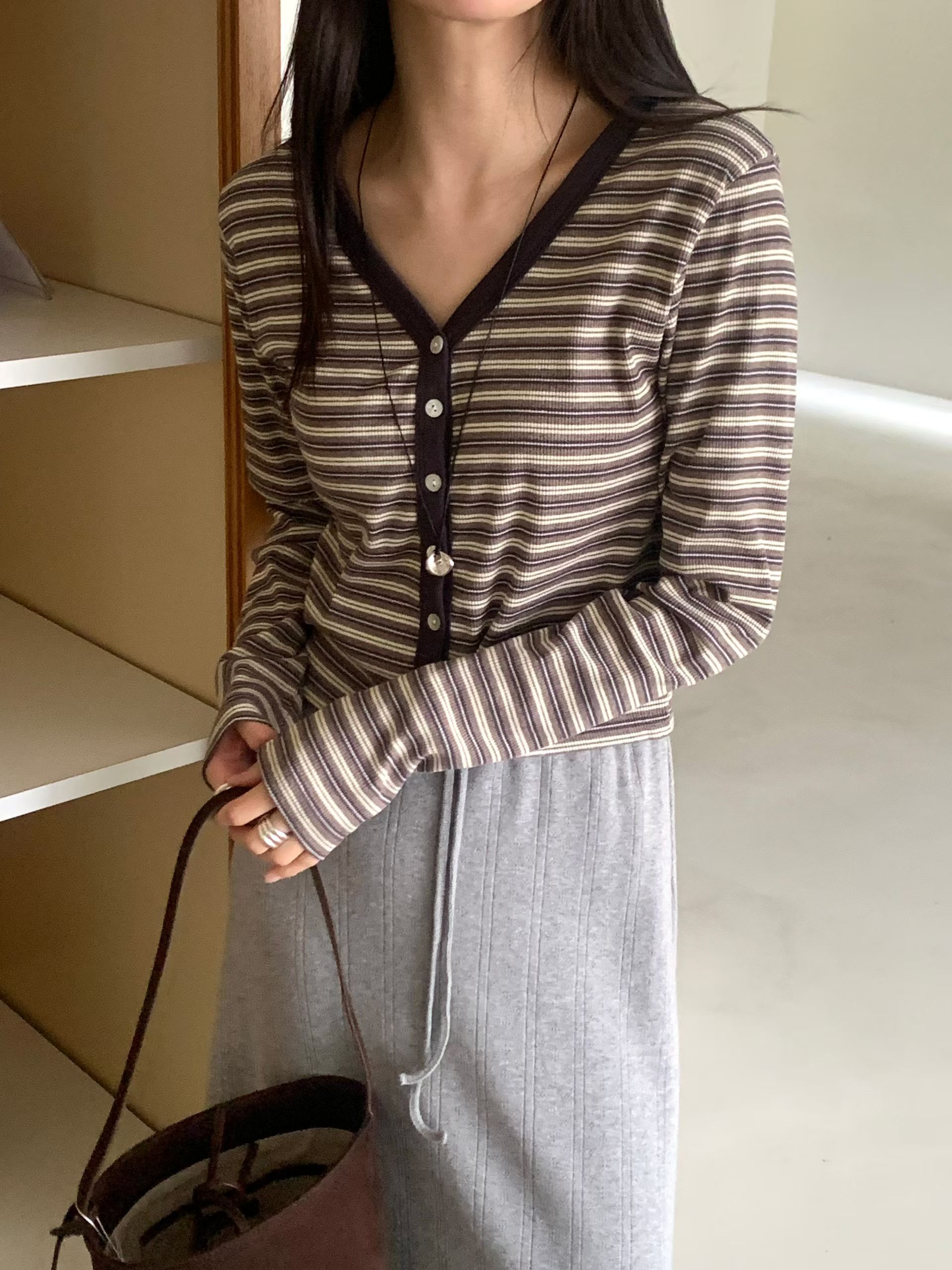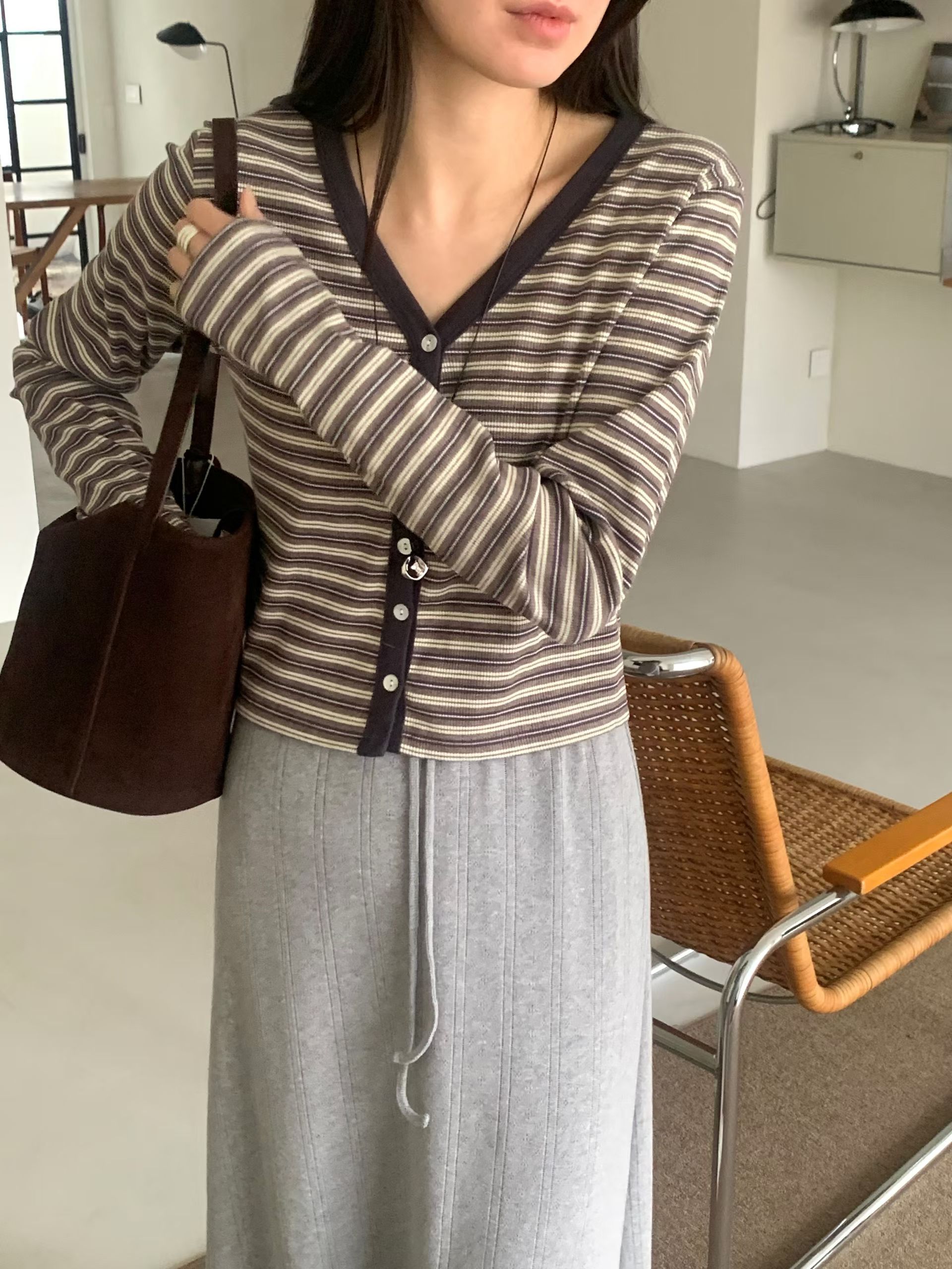 Y領撞色橫條紋排釦針織衫