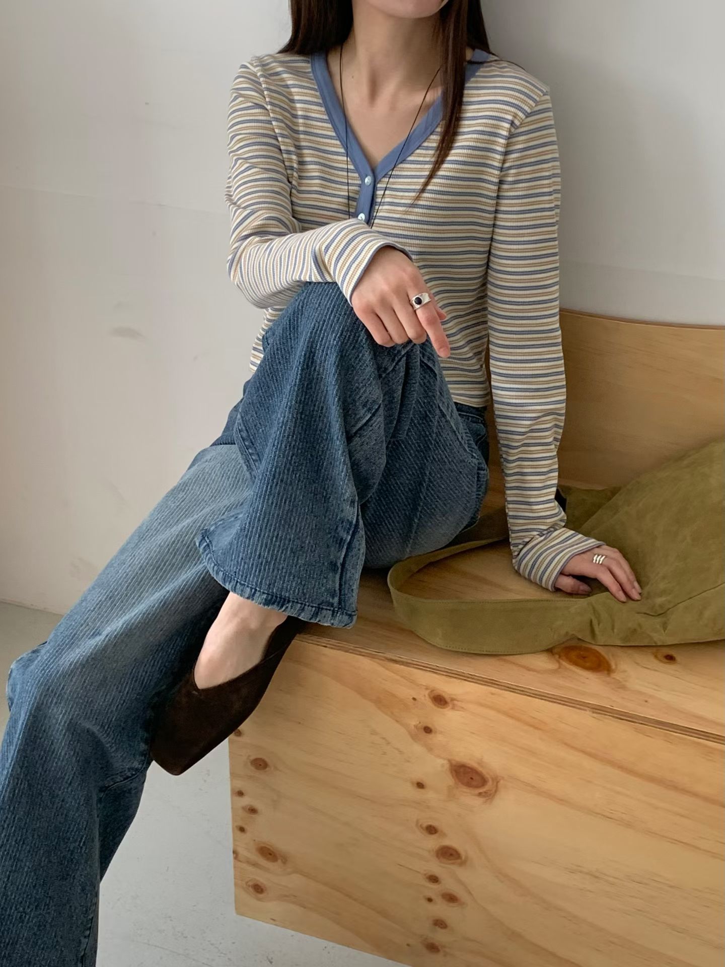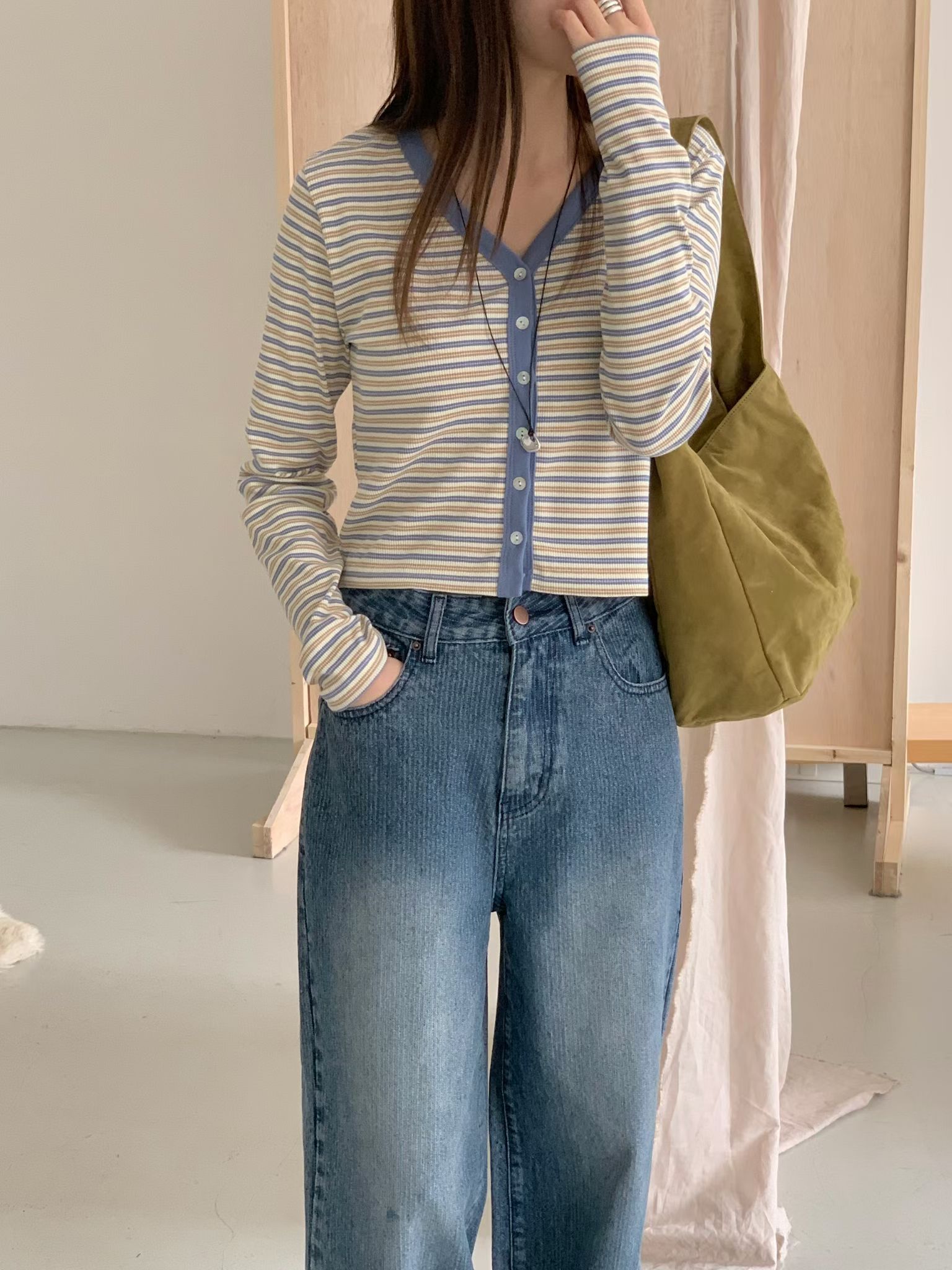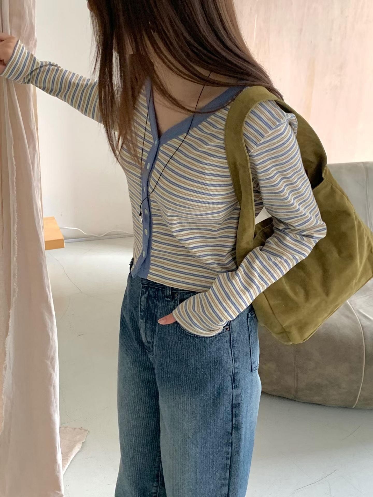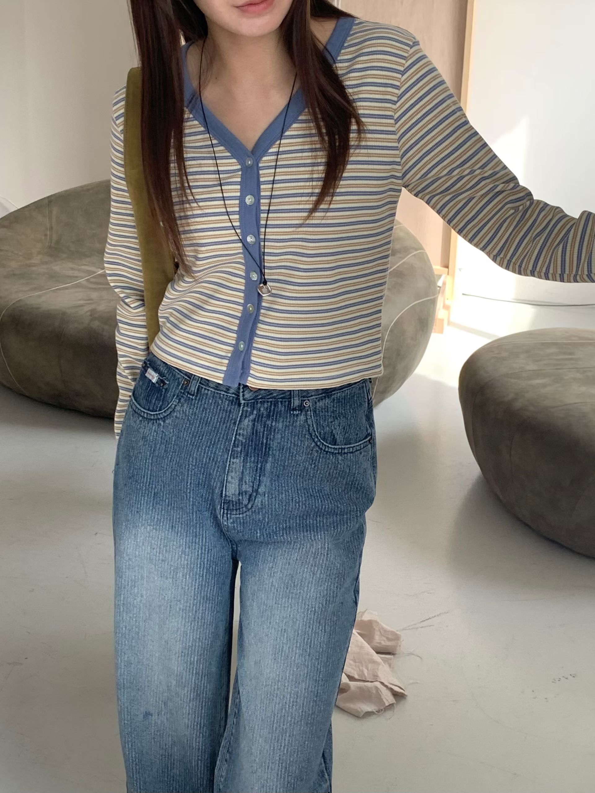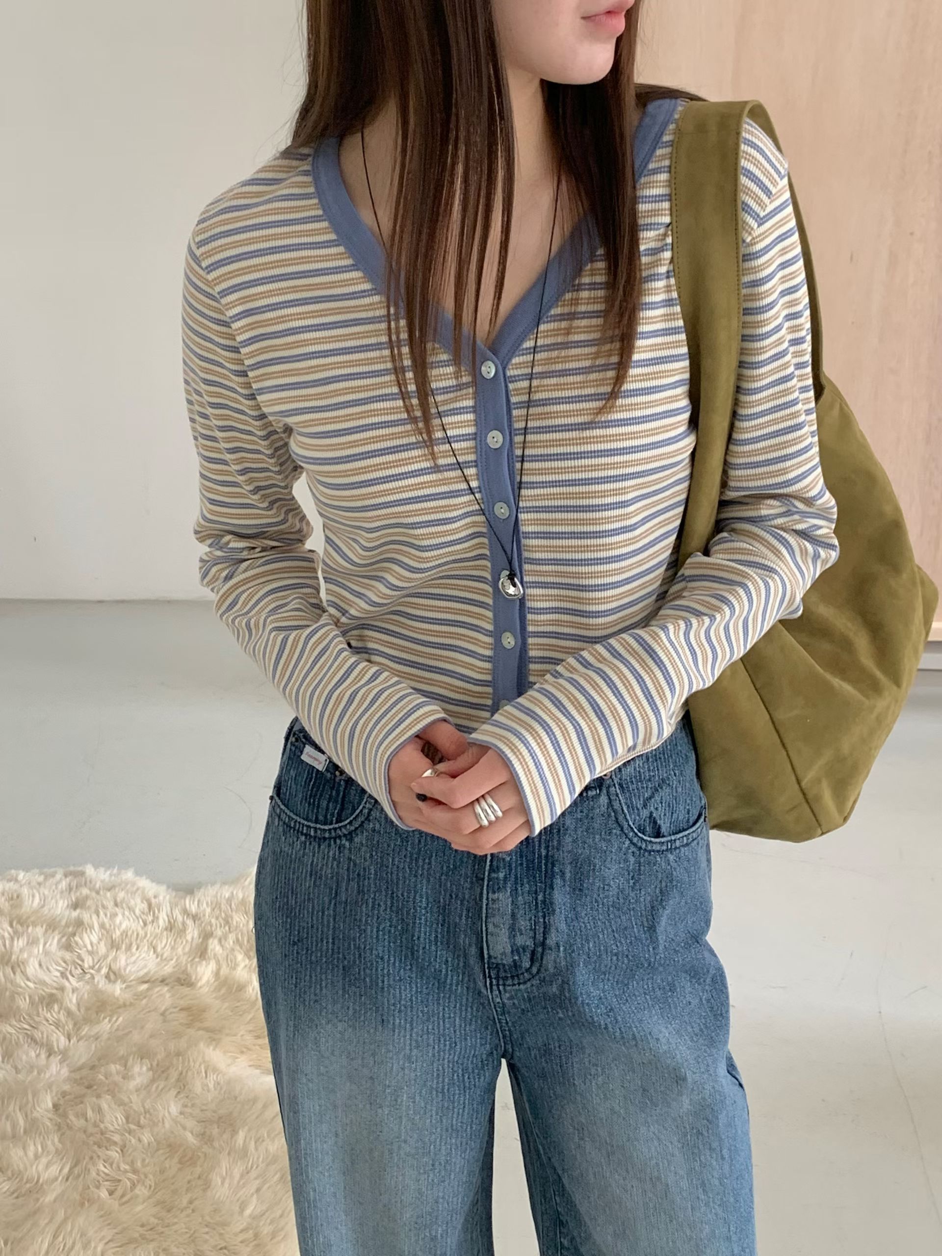 Y領撞色橫條紋排釦針織衫