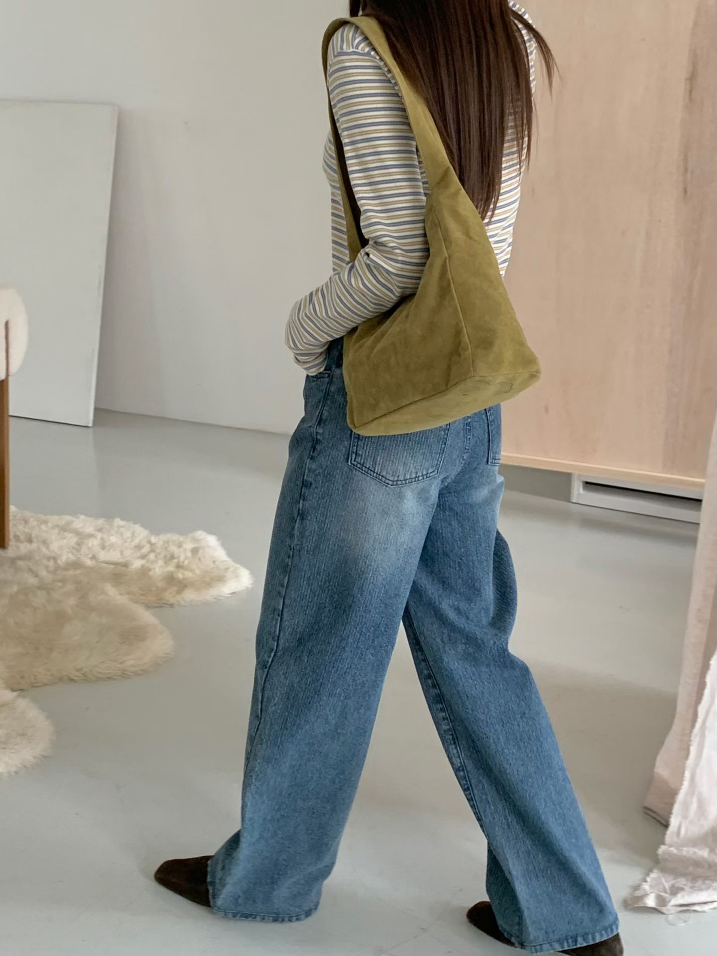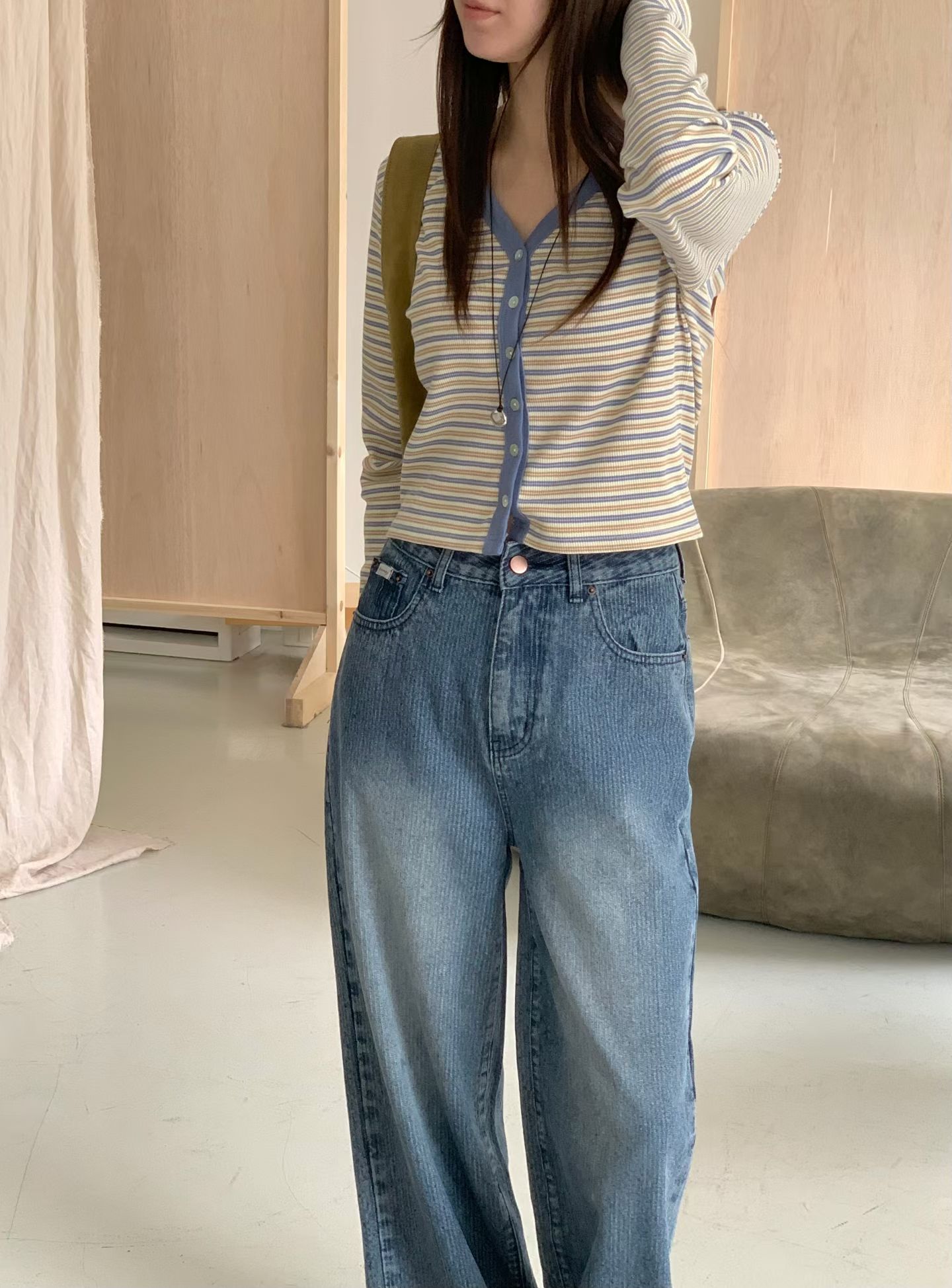 高腰復古刷色微寬落地褲