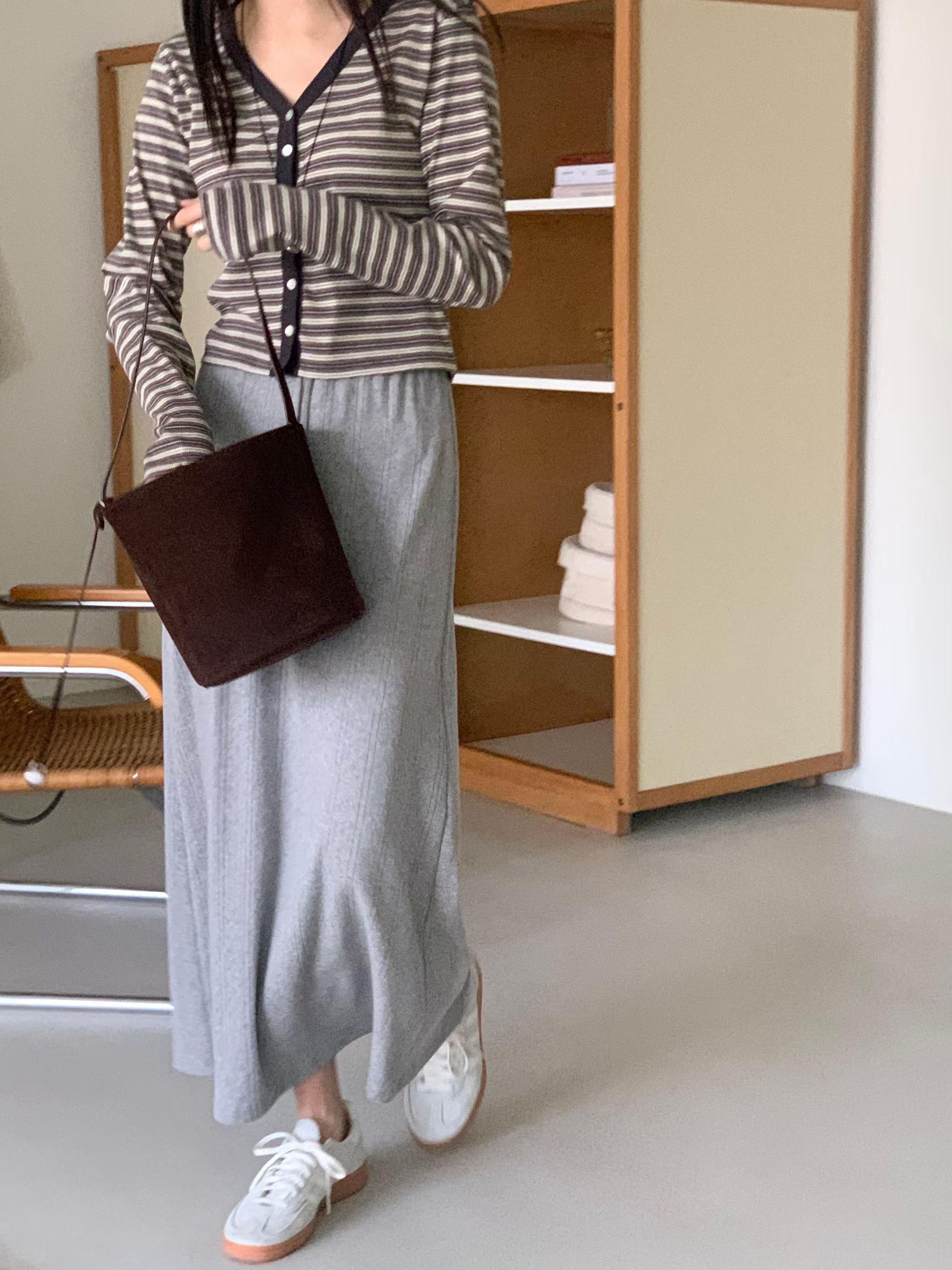 荷葉滾邊排釦針織衫+鬆緊針織長裙SET