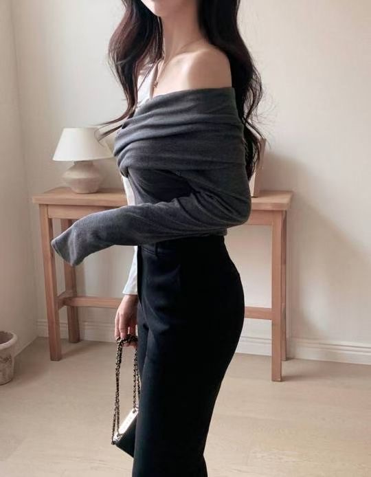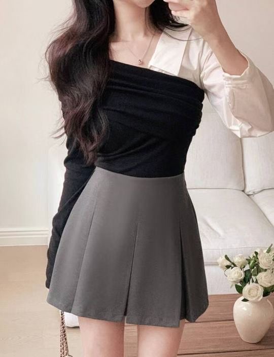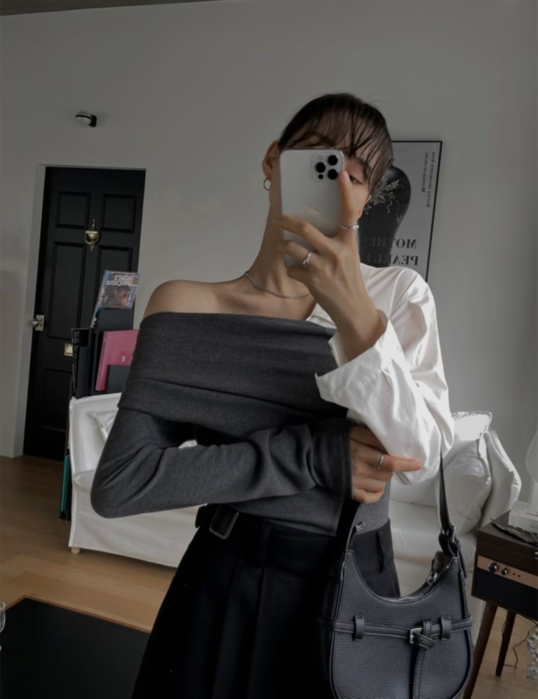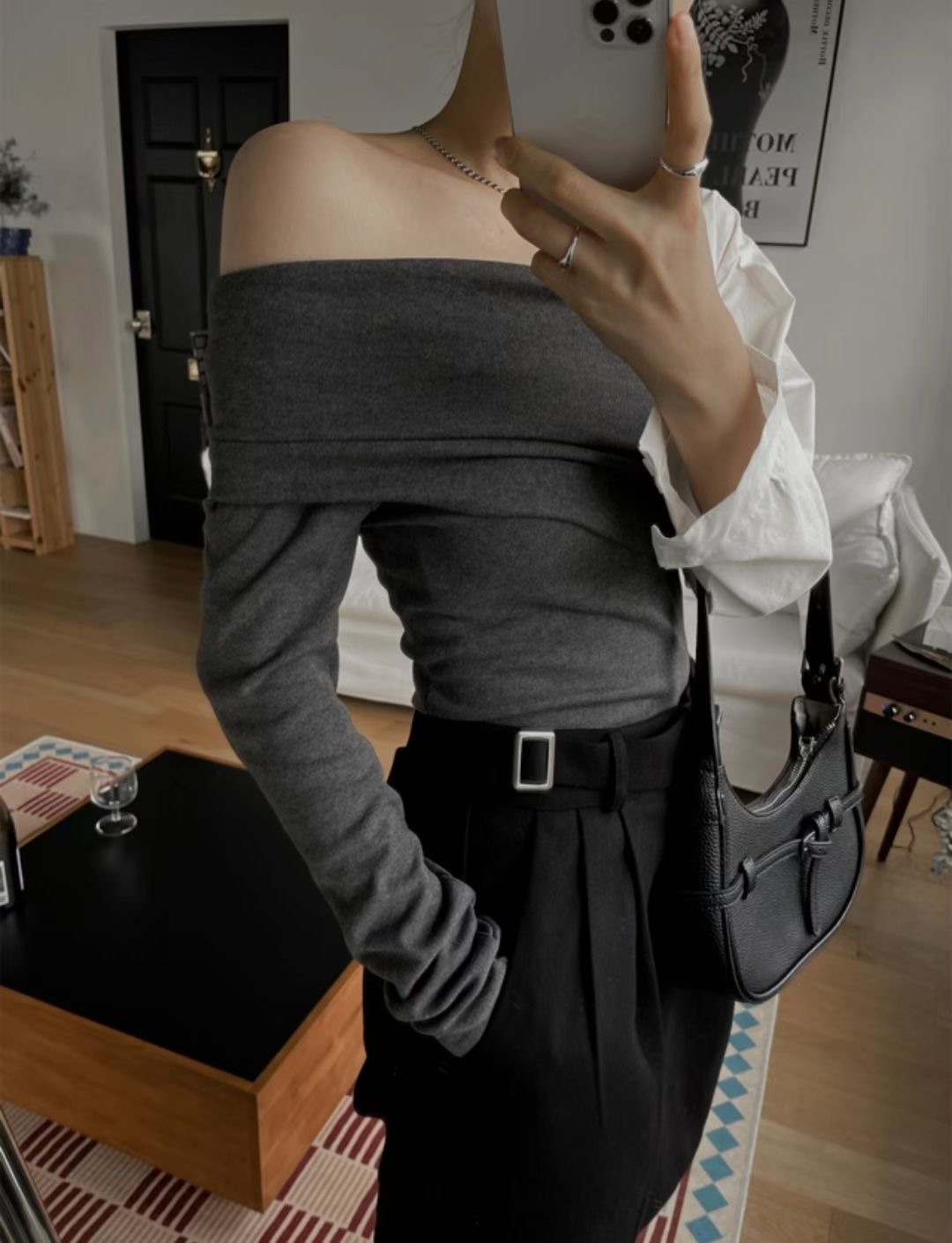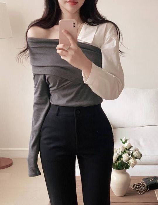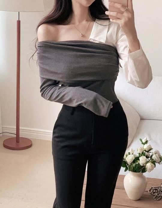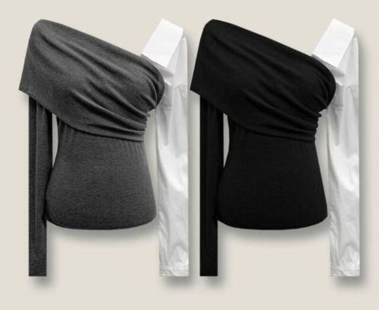 (客訂勿下單)不規則單斜肩拼接襯料上衣
